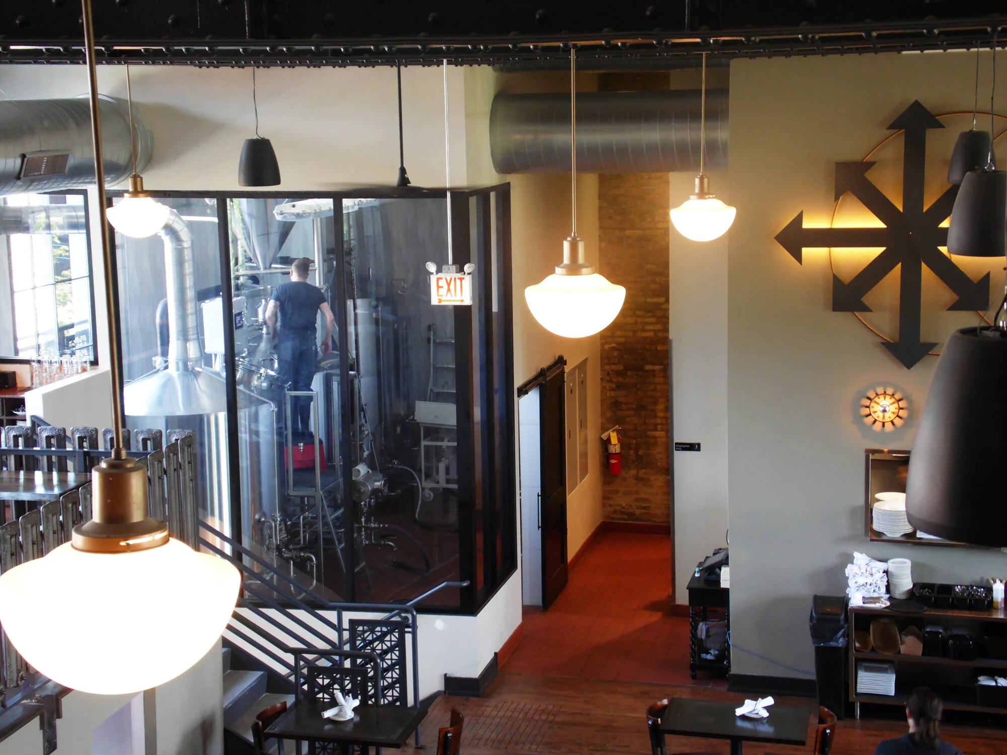 1st floor seating deck atop basement fermentation room with tank view windows